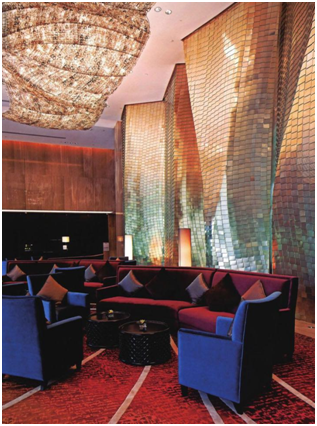 設(shè)計師用大自然中抽取各種自然元素,山、水、云、星混為一體,黃色、綠色、白色等營造出一種豐收、喜悅以及祥和的氛圍,有一種城市中的森林之感。大堂的裝飾非凡,包括一面黃金雕塑墻面和LED燈墻面,為酒店奠定了清新現(xiàn)代的風(fēng)格。在設(shè)計上墻為山、地為水、燈為云。以山為形的黃金墻仿佛太陽之光灑遍山間,閃耀金輝,天花吊頂是伴于山間的團(tuán)團(tuán)白云,仿佛流水般緩緩傾泄的花崗石紋地面與點點綠色相呼應(yīng)。