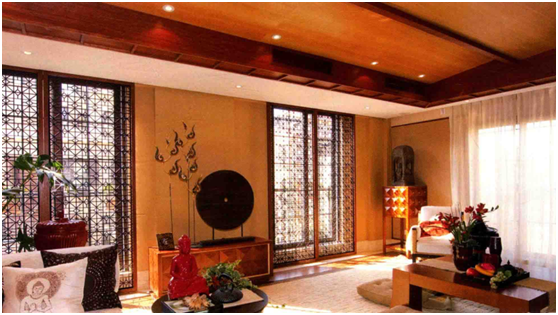 公共空間的家其具陳設(shè)在選材上經(jīng)常選用東南亞盛產(chǎn)的竹、木、藤等自然綠色環(huán)保的材料為主,通常家具以兩種以上的材料進(jìn)行混合搭配制作而成,例如藤條與木材,竹子與藤條,利用材料的寬、窄、深、淺和材料本身的機(jī)理差別進(jìn)行設(shè)計,各種不同編織手法使每件家具都呈現(xiàn)出獨特的色彩和紋理。東南亞的家具摒棄了復(fù)雜的裝飾和線條,取而代之的是簡潔柔和的設(shè)計手法,一般來說東南亞家具的結(jié)構(gòu)高度比較低矮,這有利于人們隨意地坐臥,在不經(jīng)意之中自然舒展人們的肢體,放松緊張的心情。東南亞家具以深色系為主,色彩方面融合了中式風(fēng)格的設(shè)計,采用深棕色,黑色等深色調(diào),今人感覺沉穩(wěn)大氣。由于追求舒適和休閑的生活方式,東南亞的室內(nèi)裝飾拋棄了一些中式文化世俗的程式化的觀念,使室內(nèi)環(huán)境裝飾呈現(xiàn)清新自然的特色。